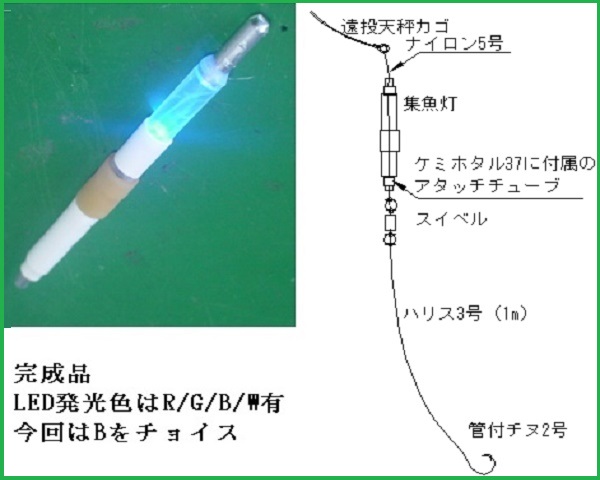 自作集魚灯は8回(約30Hr)使えるので、コスト的にもメリットがある。手持ちのLEDは、R/W/Bしかなく、実績のあるケミホタル色にしたかったが、