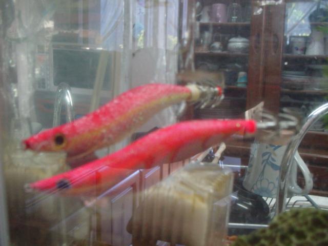 今回は、チョット飽きてきたので、ほぼ忘れかけた手持ちのエギを、レッド(蛍光)色に染めてみた。